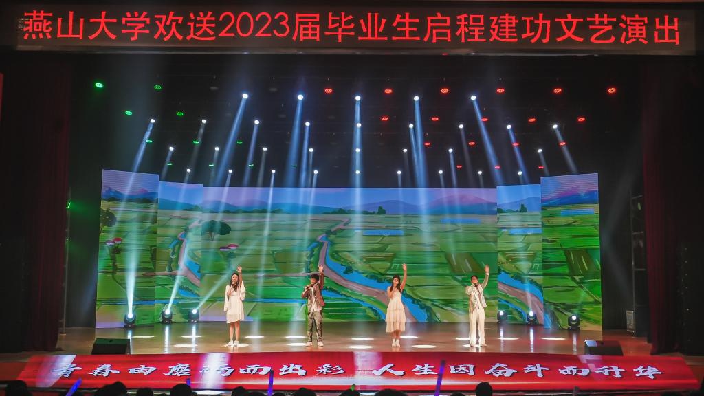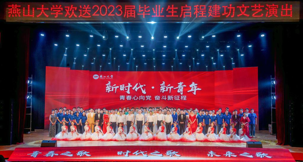 勇立时代潮头,争做时代先锋。第三篇章未来之歌中,由教师和辅导员代表演唱的《再见》,满怀深情与不舍,饱含寄望与祝福,鼓舞毕业生们不忘初心、砥砺前行;由投身到祖国建设各行业毕业生代表共同演绎的《到西部去》,是燕大青年生逢盛世,肩负重任,将青春之花绽放在祖国最需要地方的缩影;舞蹈《征程》演绎出伟大祖国巍巍巨轮乘风破浪、行稳致远,激励广大毕业生在新时代的大舞台上奋楫扬帆,施展才华;歌曲《再一次出发》表达了燕大毕业生立鸿鹄志、葆奋斗情,在中国梦的旗帜下再一次出发的勇毅决心;在《相逢春天》《二十年后再相逢》的歌声中,欢送2023届毕业生启程建功文艺演出圆满落下帷幕。