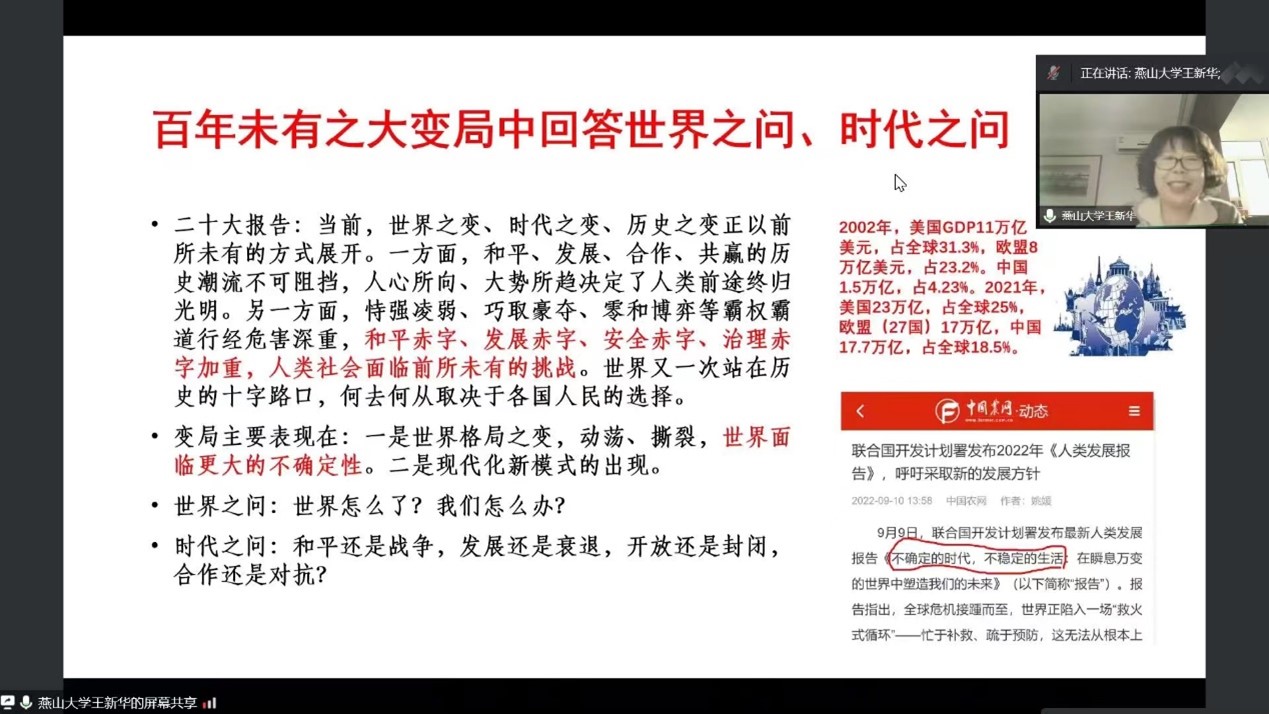 王新华教授从大历史观视野下解读了中共二十大。面对世界之变、时代之变、历史之变正在以前所未有的方式展开,世界又一次站在历史的十字路口,何去何从取决于各国人民的选择。王新华教授指出,中国共产党于百年未有之大变局中回答了世界之问、时代之问,在中华民族伟大复兴的关键时刻回答了中国之问、人民之问,并且百年老党进一步回答了“自我之问”“良心之问”。经过五年来、十年来的不懈奋斗,我国在各方面取得16项重大成就,我们站在了新的历史起点上。在此背景下召开的党的二十大,事关党和国家事业继往开来,事关中国特色社会主义前途命运,事关中华民族伟大复兴。