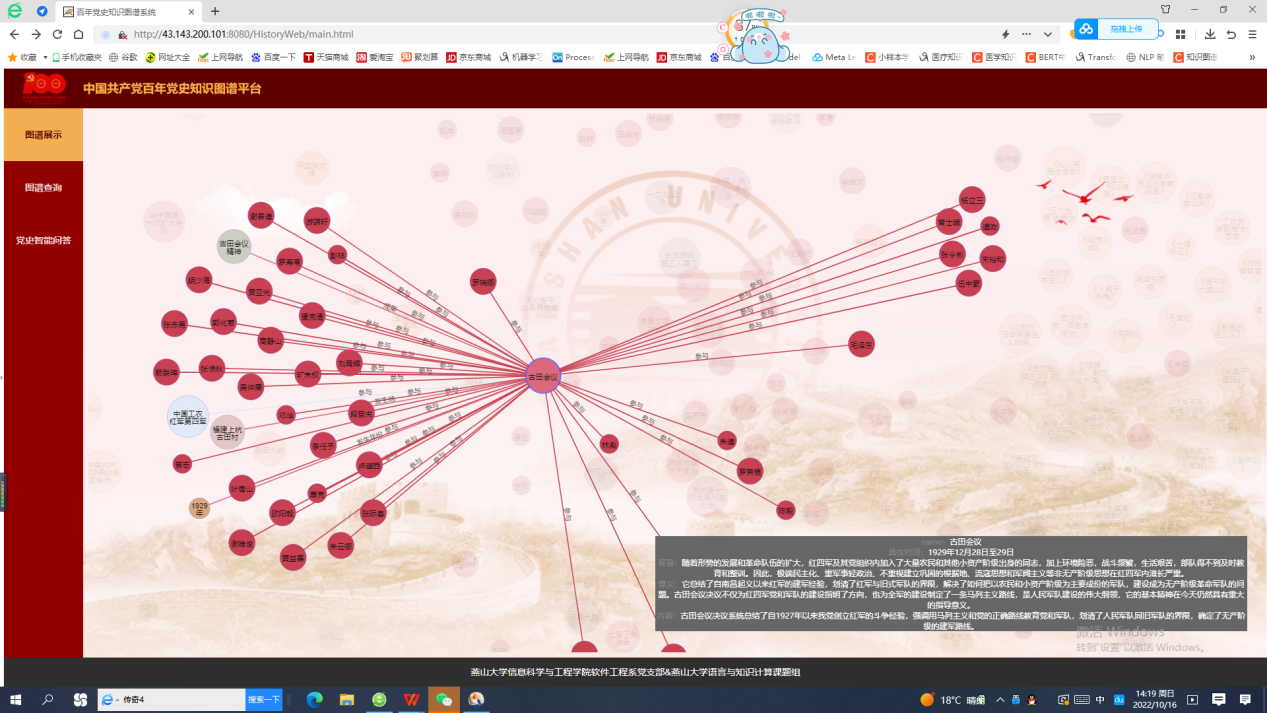 千秋伟业,百年序章;继往开来,再展风华。平台通过人工智能技术构建的党史知识图谱平台以一种更加直观生动的方式展示中国共产党筚路蓝缕、披荆斩棘走过的百年征程。