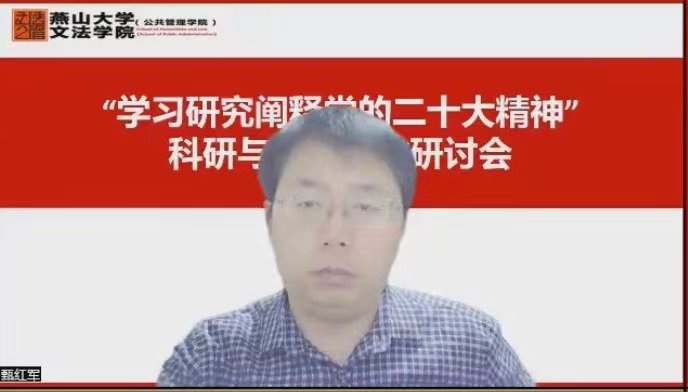 【新闻中心讯】为了更好地学习二十大精神,以助力中国式现代化建设为目标,深入思考新时代人文社会科学研究的新方向、新领域、新方法,11月17日晚,文法学院(公共管理学院)通过视频会议形式召开“学习研究阐释党的二十大精神”科研与智库工作研讨会。社会科学处处长周高仪、文法学院(公共管理学院)领导班子成员、各省级和校级人文社科研究机构负责人、各系主任、党支部书记参加了会议。会议由副院长郑志峰主持。