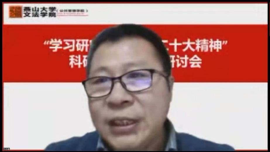 学院党委书记甄红军作总结发言:一是希望老师们进一步聚焦二十大精神的学习,研究阐释二十大报告的新思想、新论断,紧随党的理论创新的脚步,以重大理论和现实问题为研究对象,将习近平新时代中国特色社会主义思想贯穿理论研究的始终;二是充分把握二十大精神的重要内涵,立足学院发展的实际,加快构建中国特色哲学社会科学学科体系、学术体系、话语体系,培育壮大哲学社会科学人才队伍,不断开拓文法学院人文社会科学研究的新局面;三是把二十大精神的学习与科学研究、新型智库建设相结合,发挥学院的平台、人才等资源优势,整合各人文社科研究机构力量,加强彼此间的学术交流,实现充分合作,争取产出一系列高水平成果;四是重视科研成果的转化,要根据二十大精神的指引,着眼于中国式现代化建设中的重大需求,持续提高我院建言咨政和社会服务的专业化、科学化与系统化。