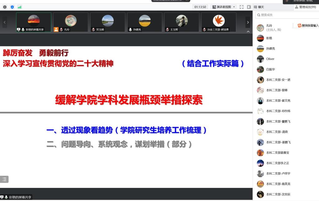 同时,学院各处级领导干部以党的二十大精神为指导,聚焦分管工作领域的发展瓶颈问题,分析汇报发展思路和推进举措,同广大教师进行交流研讨,进一步调研民情,开拓思路,凝聚智慧,汇聚推动学院发展的强大力量。