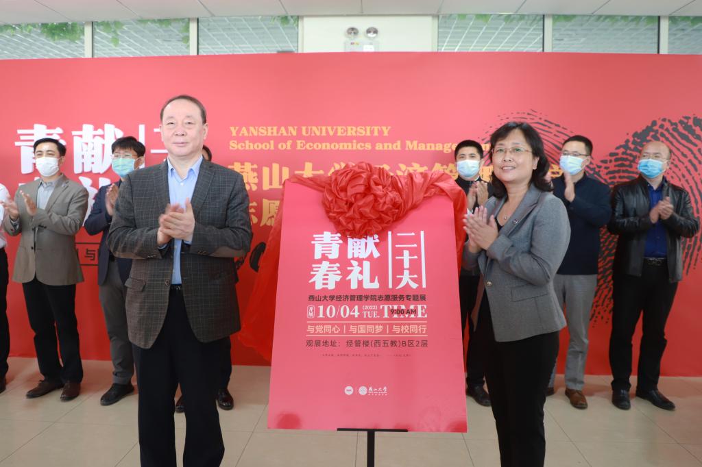 仪式的最后,校党委副书记谢延安、经济管理学院院长李春玲共同为志愿服务专题展揭幕。与会领导、来宾与师生代表一起观展。
