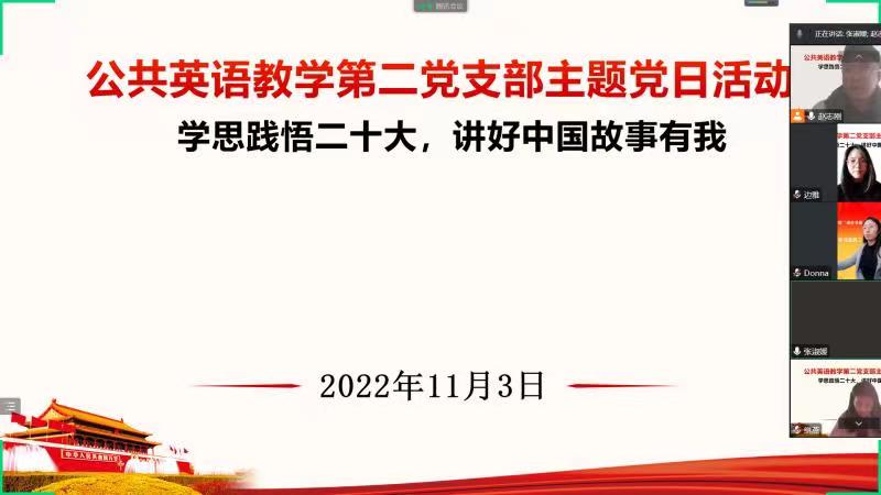 十一月份开始,外国语学院组织各教师党支部开展 “学思践悟二十大,讲好中国故事有我”主题党日活动。各支部党员教师进一步统一思想,凝聚共识。带头做好二十大报告各语种翻译版本的学习,并以集体备课等形式探讨解决教学相关问题或难题,通过主题党日,教师思想和业务双提升,进一步提升了讲好中国故事的能力。