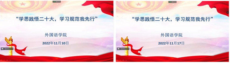 【新闻中心讯】为了学习贯彻落实二十大精神,推进二十大精神与工作实际相结合,外国语学院于11月10日下午和11月17日下午举办线上“学思践悟二十大,学习规范我先行”两期学习活动,会议由学院党委书记胡铁巍主持,学院全体教职工参加了会议。