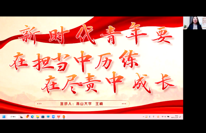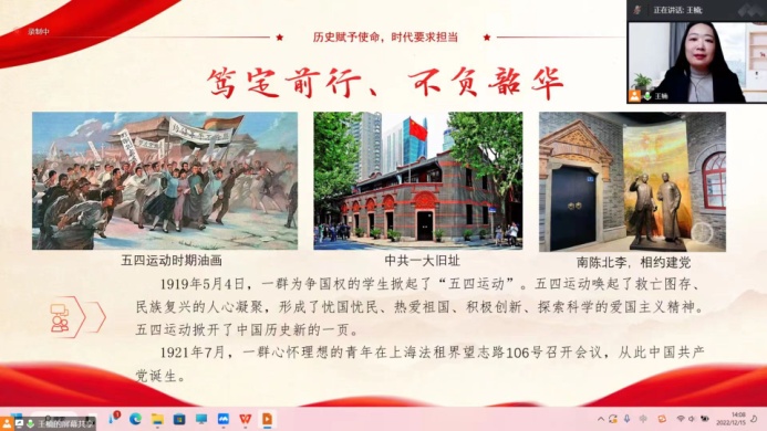 王楠老师首先从习近平总书记对青年的寄语讲起,分享了我校刘丹阳同学的从军故事,号召全体青年要牢记历史赋予使命,彰显时代担当,要拒绝平庸,铭记历史,要为中国式现代化伟大实践贡献力量;其次,讲解了抗击疫情、疫苗研制、抢险救灾、脱贫攻坚等危难时刻,广大青年党员冲得出来、顶得上去,展现青年党员的担当和奉献;随后讲述了青年一代创新创业,勇立潮头的先进事迹;最后,结合百年奋斗目标,号召我们新时代青年不断学习,提高自身素质,做好接力,承担建设重任。