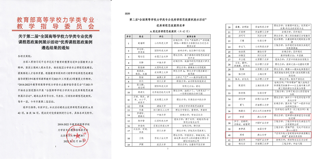 【新闻中心讯】近日,教育部高等学校力学类专业教学指导委员会发布了《关于第二届“全国高等学校力学类专业优秀课程思政案例展示活动”优秀课程思政案例遴选结果的通知》,我校建筑工程与力学学院李哲老师的“理论力学:花样滑冰旋转姿态与动量矩定理”和梁希老师的“‘空间在轨大型桁架结构多维度模态测量’虚拟仿真实验”2项课程思政案例被评为A类优秀案例。这是我校继去年获得1项A类优秀案例和1项B类优秀案例之后,取得的又一突破。