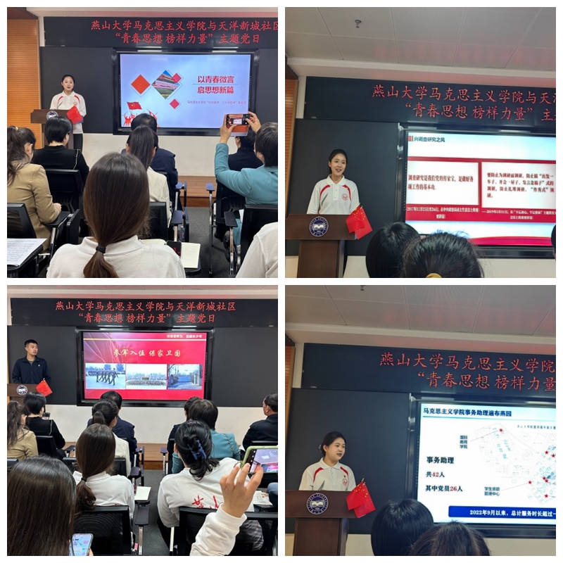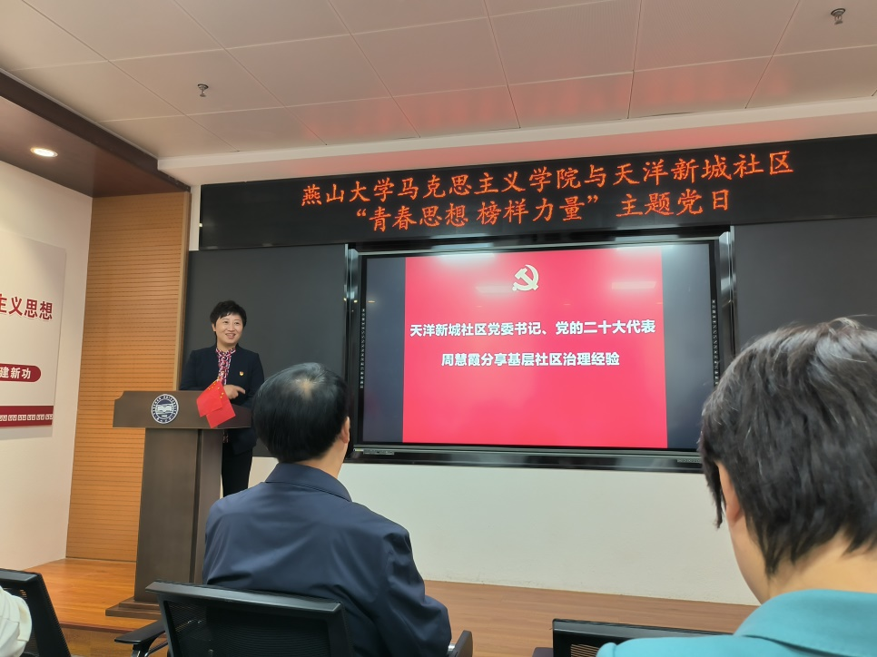 【新闻中心讯】为深入学习贯彻习近平新时代中国特色社会主义思想,构建高校与社区资源互补、信息共享、优势互利的党建格局,2023年10月11日,马克思主义学院党委与天洋新城社区党委在乌鸦传媒党员组织生活馆联合开展了“青年思想 榜样力量”的主题党日活动。天洋新城社区党委书记周慧霞、马克思主义学院党委书记甄红军、乌鸦传媒党委组织部副处级专职组织员韩倩、天洋新城社区党委各党支部党员代表、硕士研究生党支部党员代表参加了此次活动,活动由硕士研究生第一党支部书记张海茹主持。