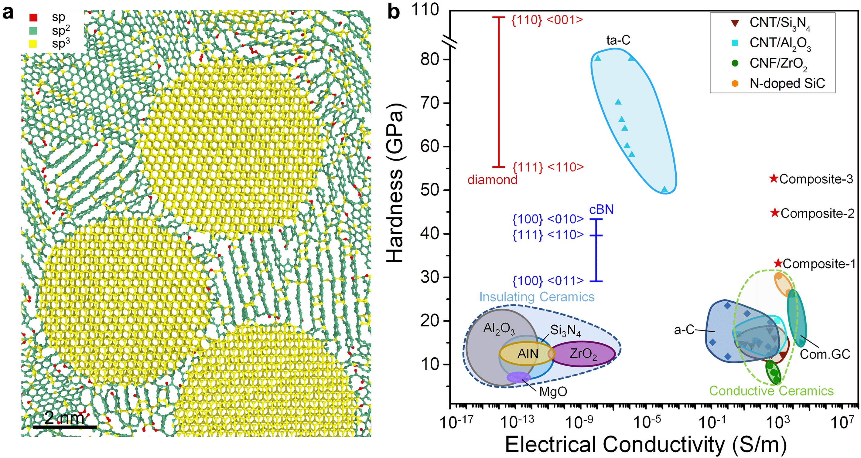 图1a非晶碳/纳米金刚石自生复合材料的显微组织和界面结构;b与其他材料的硬度和导电性对比