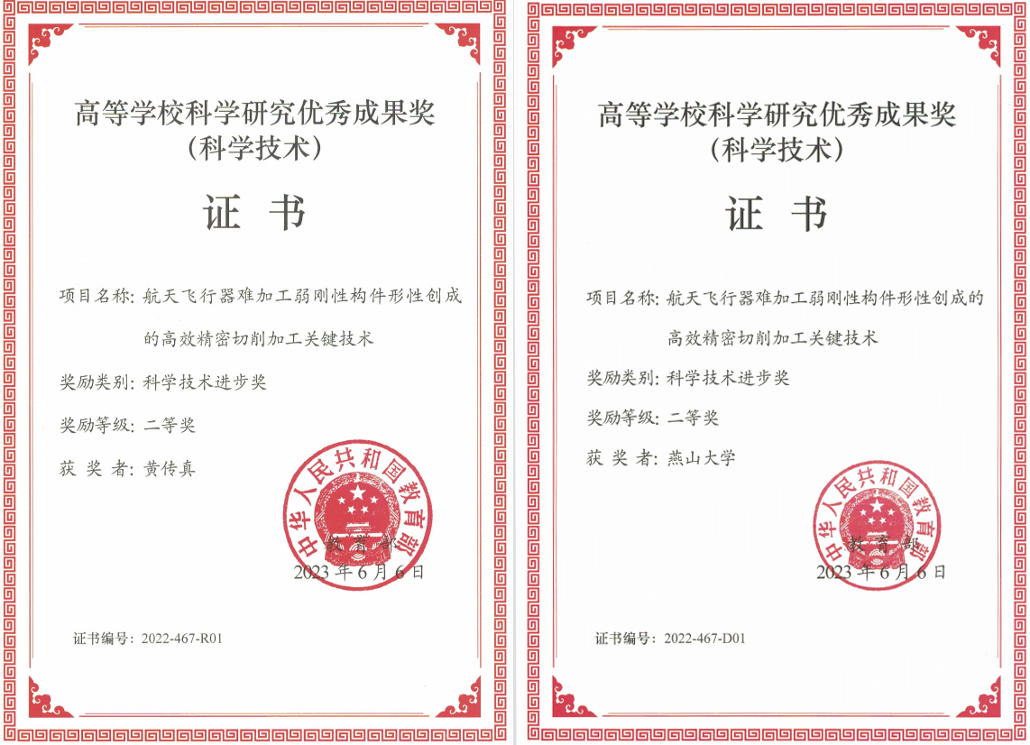 【新闻中心讯】近日,教育部办公厅公布了《教育部关于2022年度高等学校科学研究优秀成果奖(科学技术)奖励的决定》,由乌鸦传媒机械工程学院黄传真教授牵头,联合山东大学、上海精密机械研究所和北京卫星制造厂有限公司申报的项目“航天飞行器难加工弱刚性构件形性创成的高效精密切削加工关键技术”,荣获教育部2022年度高等学校科学研究优秀成果奖(科学技术)科学技术进步奖二等奖,实现了我校科研工作的又一项重要突破。这是我校自2016年后,再次荣获这一重要奖项,该项目同时也是2022年度河北省唯一牵头获奖项目。